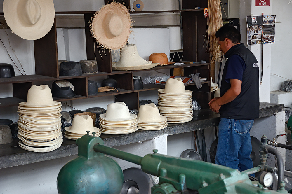 Unverdrossen wie wir sind, hoffen wir darauf, trotz plattgelaufener Füße auf dem Rückweg zum Hotel beim "Museo del Sombrero" mehr Glück zu haben. Und – oh Wunder! – dieses gibt es tatsächlich und wir betreten das an der Calle Darpa gelegene Fabrik/Museum durch einen langen Gebäudeschlauch. Erstaunlicherweise kostet es keinen Eintritt, finanziert sich aber wahrscheinlich durch das angeschlossene kleine Cafe mit Flußblick und durch den Verkauf der ausgestellten Hüte.