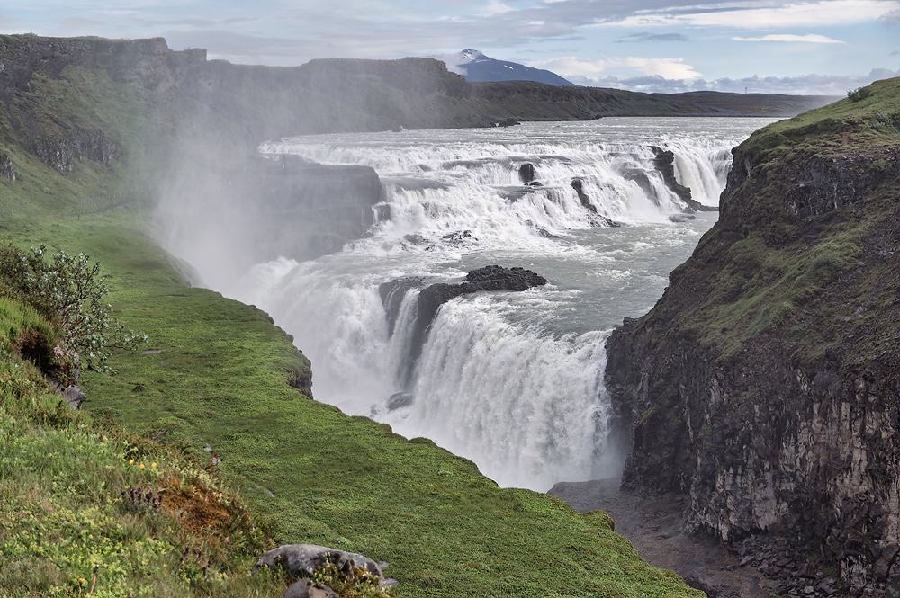 Der Gullfoss verdankt seine fortbestehende Existenz nicht zuletzt der Tochter des hier am Anfang des 20. Jahrhunderts lebenden Grundbesitzers, dem Bauern Tómas Tómasson. Sigriður Tómasdóttír widersetzte sich vehement den Bestrebungen, an diesem Fall ein Wasserkraftwerk zu errichten und lief aus Protest barfuß bis nach Reykjavik. Es war zwar nicht ihr Einspruch und die Drohung, sich in den Fall zu stürzen, welcher den Bau verhinderte, sondern das Geld, welches den Investoren während des Baustopps ausging – womit glücklicherweise alles so verblieb, wie es war. Heute kann der isländische Staat dieser Wendung dankbar sein, denn die Einkünfte aus dem touristischen Massenbetrieb sind nicht unerheblich. Nachdem der Gullfoss von allen Seiten, mit und ohne Abfluß dokumentiert ist, machen wir uns auf den Weg zum Keriðkrater.