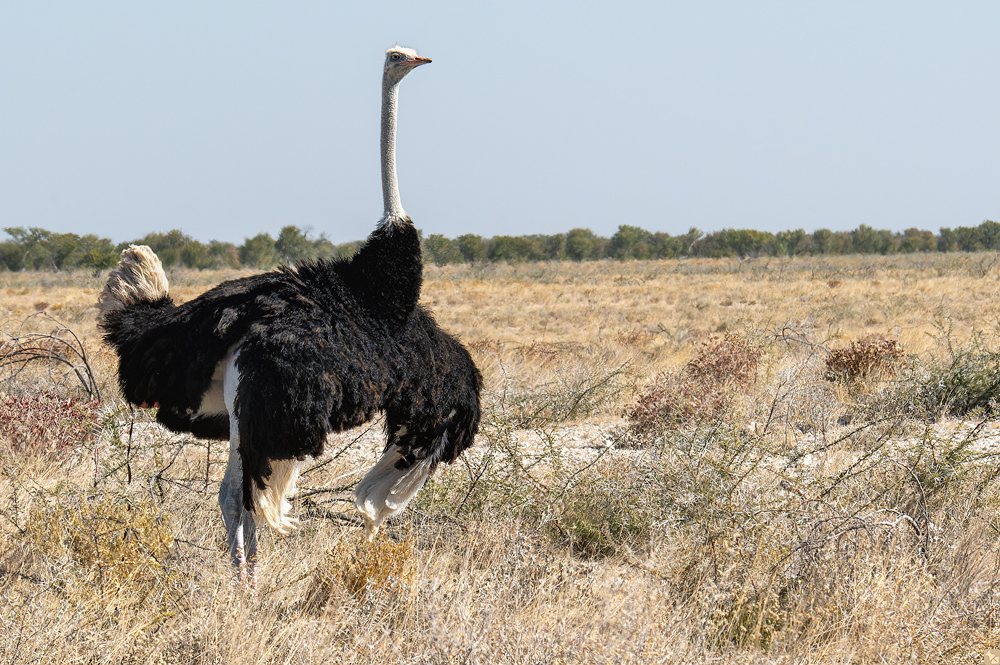 Endlich sehen wir auch zwei Steppenelefanten durch den dichten Strauchbewuchs näher kommen. Da sie aber verdeckt bleiben, widmen wir uns lieber dem balzenden Straußenpaar, welches so vertieft ins Gegenüber ist, dass die sonst obligatorische Flucht vergessen scheint.