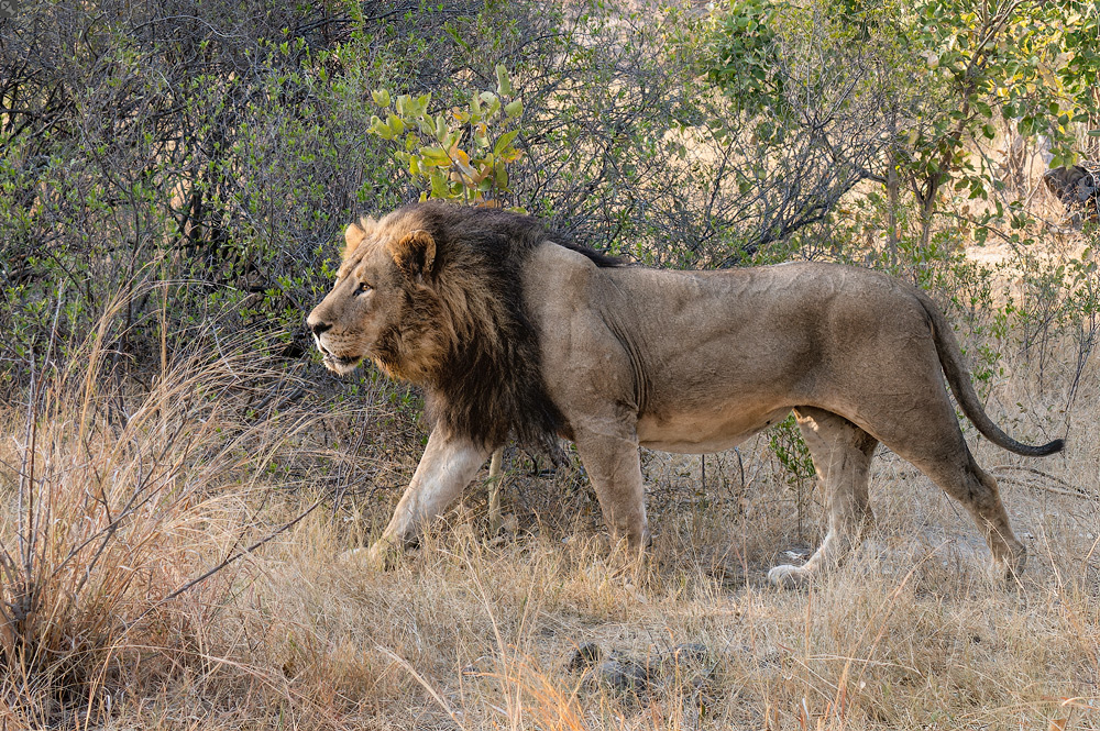 Es dauert keine zehn Sekunden und der massige Körper des Löwen kommt tatsächlich hinter dem Busch hervor und trottet auf den Fahrweg hinter uns. Wir sitzen mucksmäuschenstill im abgestellten Jeep, während Leo – ohne uns auch nur eines einzigen Blickes zu würdigen – zwei Meter an uns vorbeischlendert. Weiter vorne bläst er dreimal brüllend weiße Atemwolken in die noch kalte Luft und markiert sein Revier, bevor er sich in aller Seelenruhe erst einmal niederlegt.